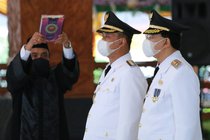 Upacara pengambilan sumpah jabatan dan pelantikan Wali Kota dan Wakil Wali Kota Magelang serta pelantikan Ketua Tim Penggerak PKK dan Ketua Dekranasda Kota Magelang dilaksanakan secara virtual